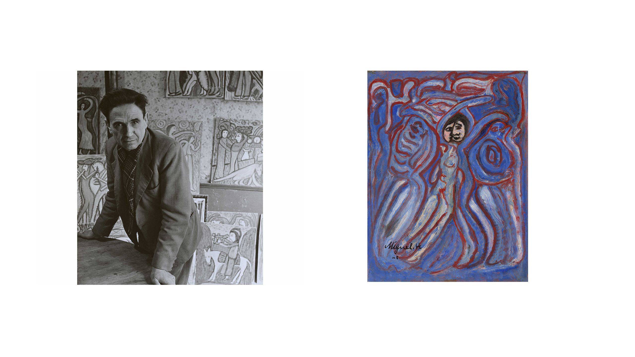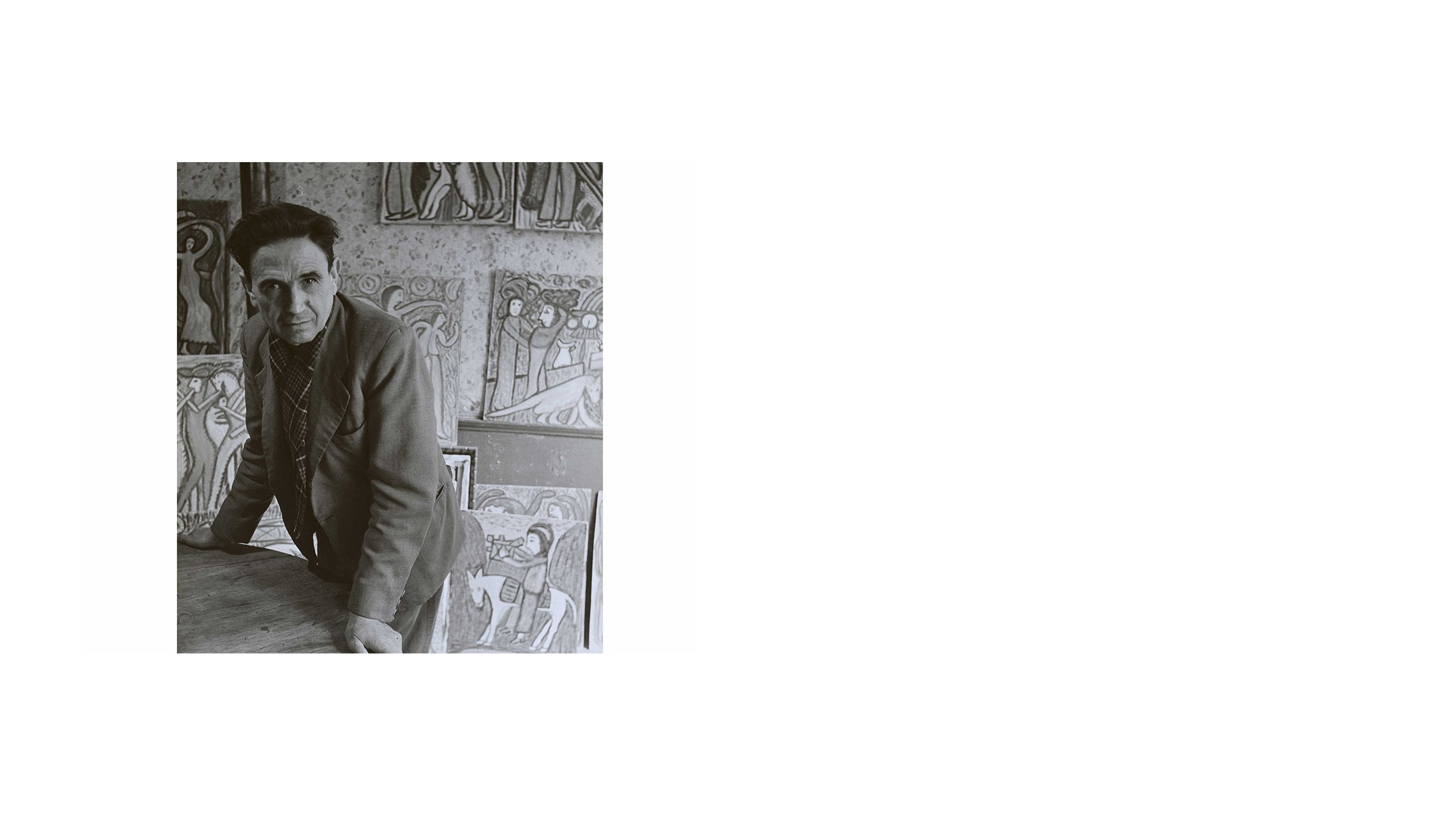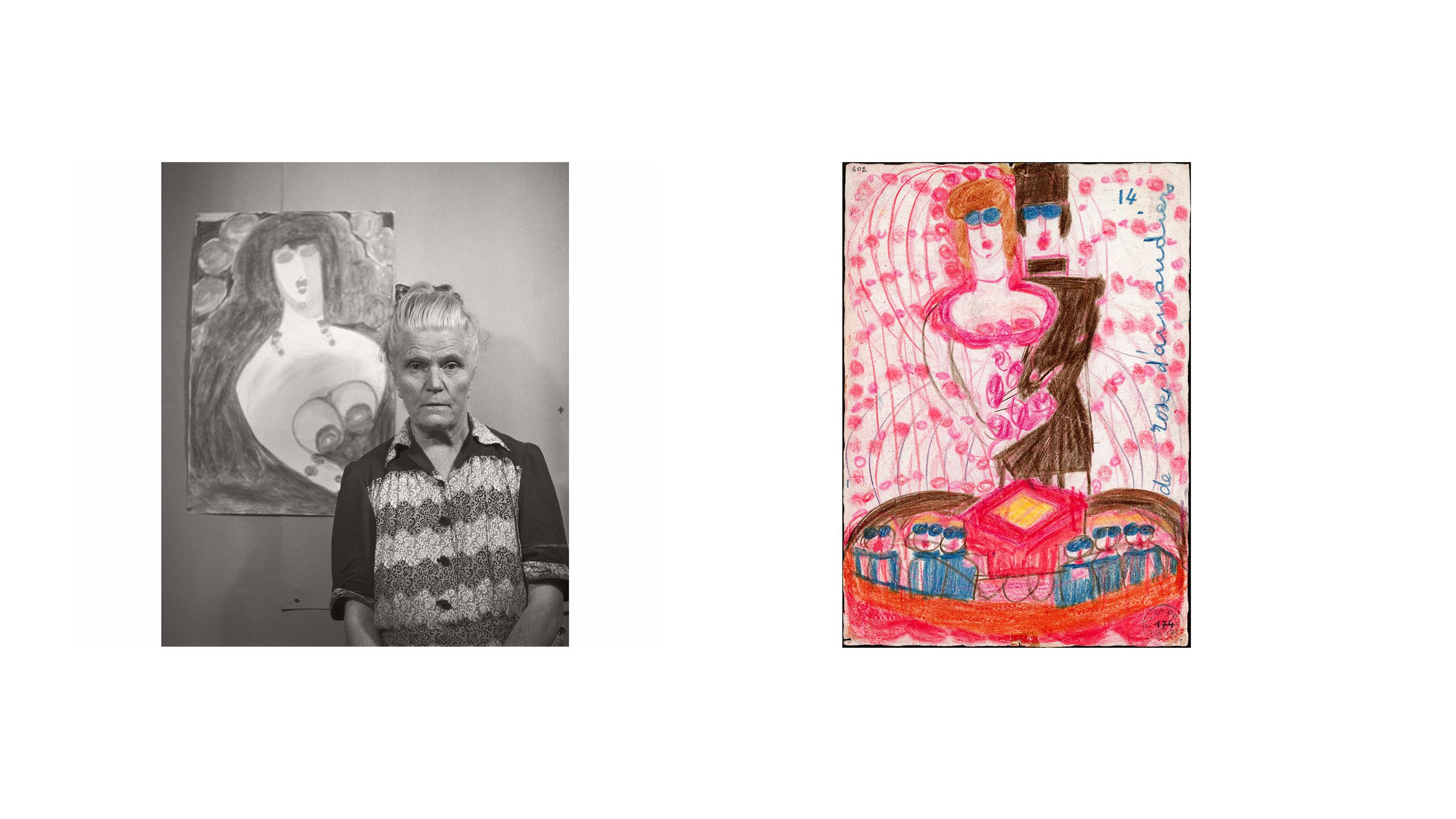 We know that in some instances Dubuffet directly corresponded with artists and arranged to purchase a work for an agreed price. Sales for artworks bought from Miguel Hernandez (1893-1957), Pascal-Désir Maisonneuve (1863-1934), and Henri Salingardes (1872-1947) were documented in ledgers kept at the time. More frequently, artworks were gifted to him, or psychiatrists in psychiatric institutions gave him work they thought would be of interest, and that would be well cared for in his collection. In these instances, patients did not receive a fee and were not aware that their work was being shown in public. Dubuffet was known to send the artists gifts such as paint, brushes, cigarettes, and small amounts of money. Displaying the work of psychiatric patients without their knowledge raises important ethical questions about consent and medical confidentiality and we acknowledge that this is a problematic element of Dubuffet’s collecting practice. Art Brut historians similarly recognise the challenging nature of these donations but have reached a consensus that doctors at this time were acting in good faith and that many had prolonged periods of engagement with their patients and enormous admiration for their artwork.