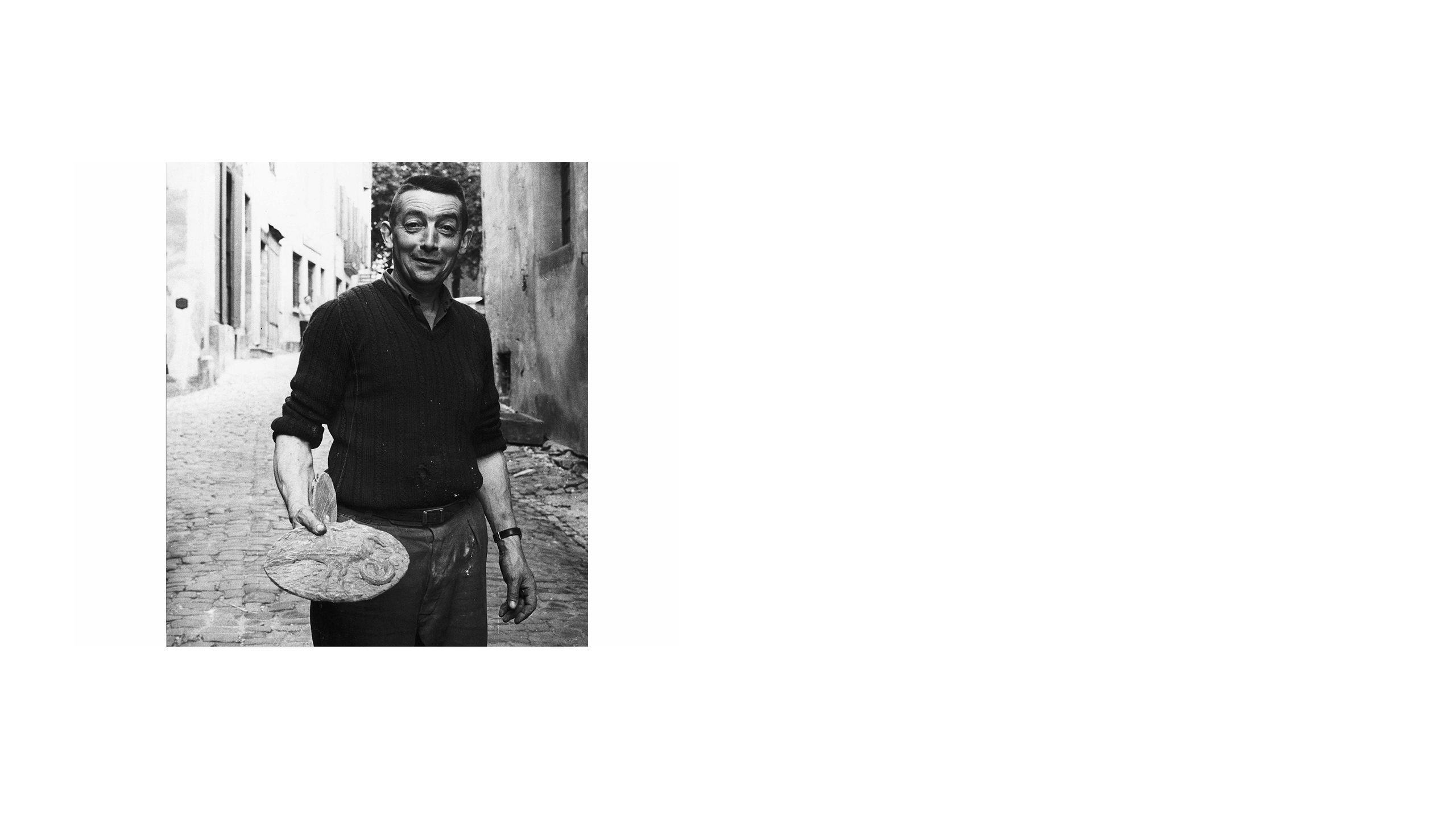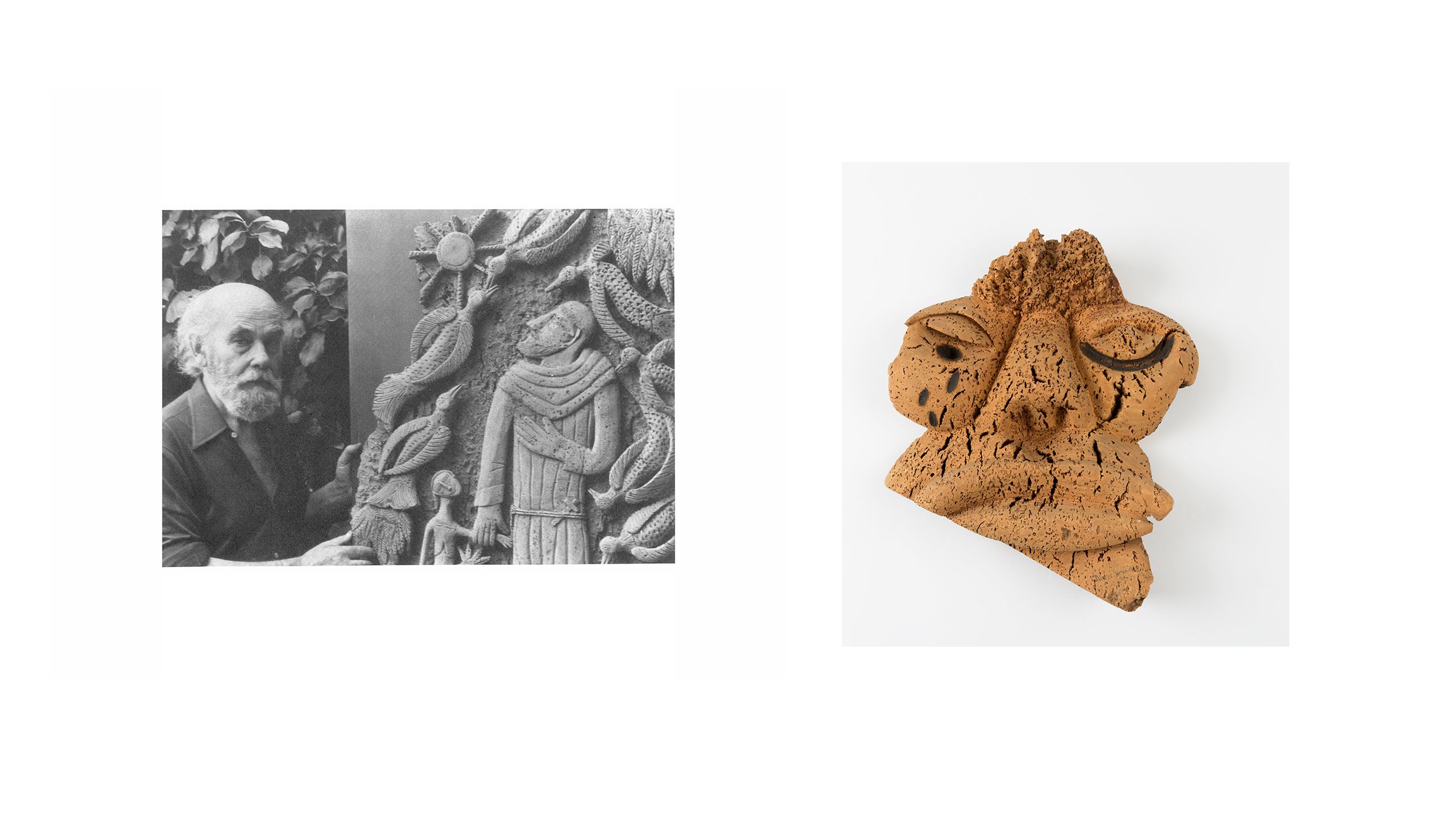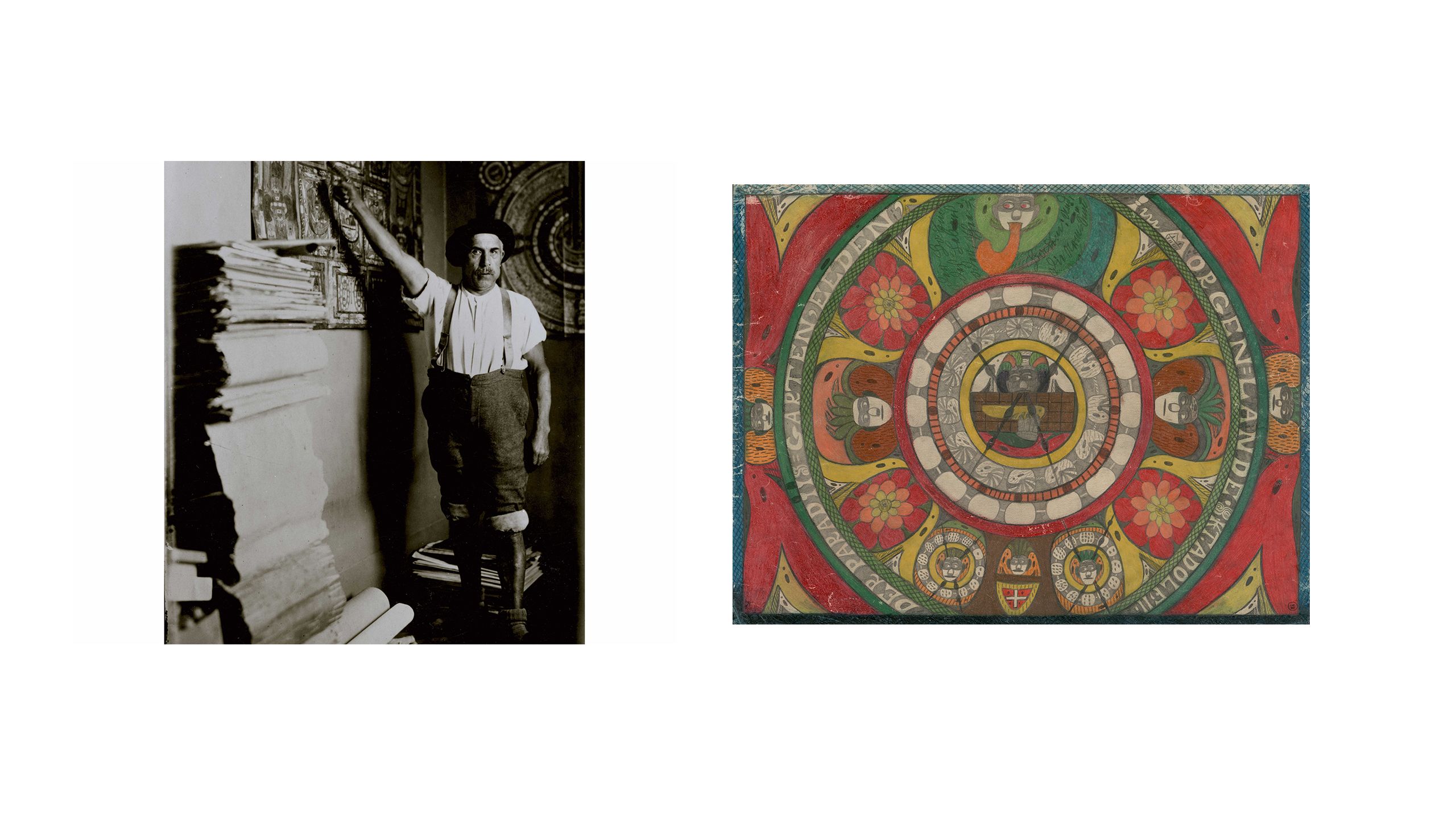 Dubuffet returned to Paris with two suitcases full of artwork and a mind overflowing with ideas: his aim was to write and illustrate sixteen short journals to draw attention to these artists. He embarked on a period of energetic research and collecting, forming a notable network of contacts across Europe who would assist his search. Dubuffet simultaneously worked to define his criteria; while he had collected many examples of art made in psychiatric hospitals, Art Brut was by no means a shorthand for art made by those with mental illness. For example, some of his early acquisitions were works by the self-trained cork-carver Joaquim Vicens Gironella (1911-1997), the Spiritualist painter Fleury-Joseph Crépin (1875-1948) and an innkeeper called Henri Salingardes (1872-1947) who poured cement medallions in his garden before decorating them with paint, glass and fur.