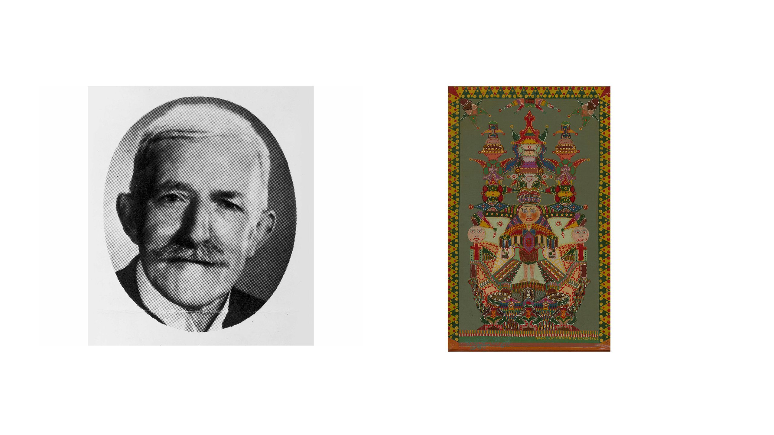 ‘Art Brut’ is a term that was coined in 1945 by the French artist Jean Dubuffet (1901-85) to refer to art made by individuals working outside of the established cultural mainstream. In English, it tends to be translated as ‘Outsider Art’, which is the phrase Roger Cardinal used for his book on the topic in 1972. But since Dubuffet fought against established cultural norms and was critical of labelling anyone an ‘outsider’, we’ve decided to keep his original term throughout our discussions of this work.