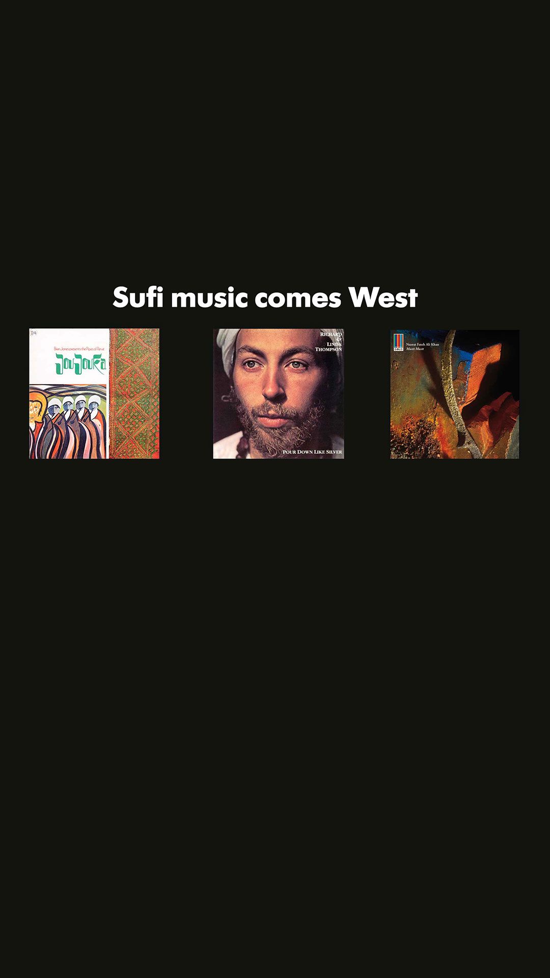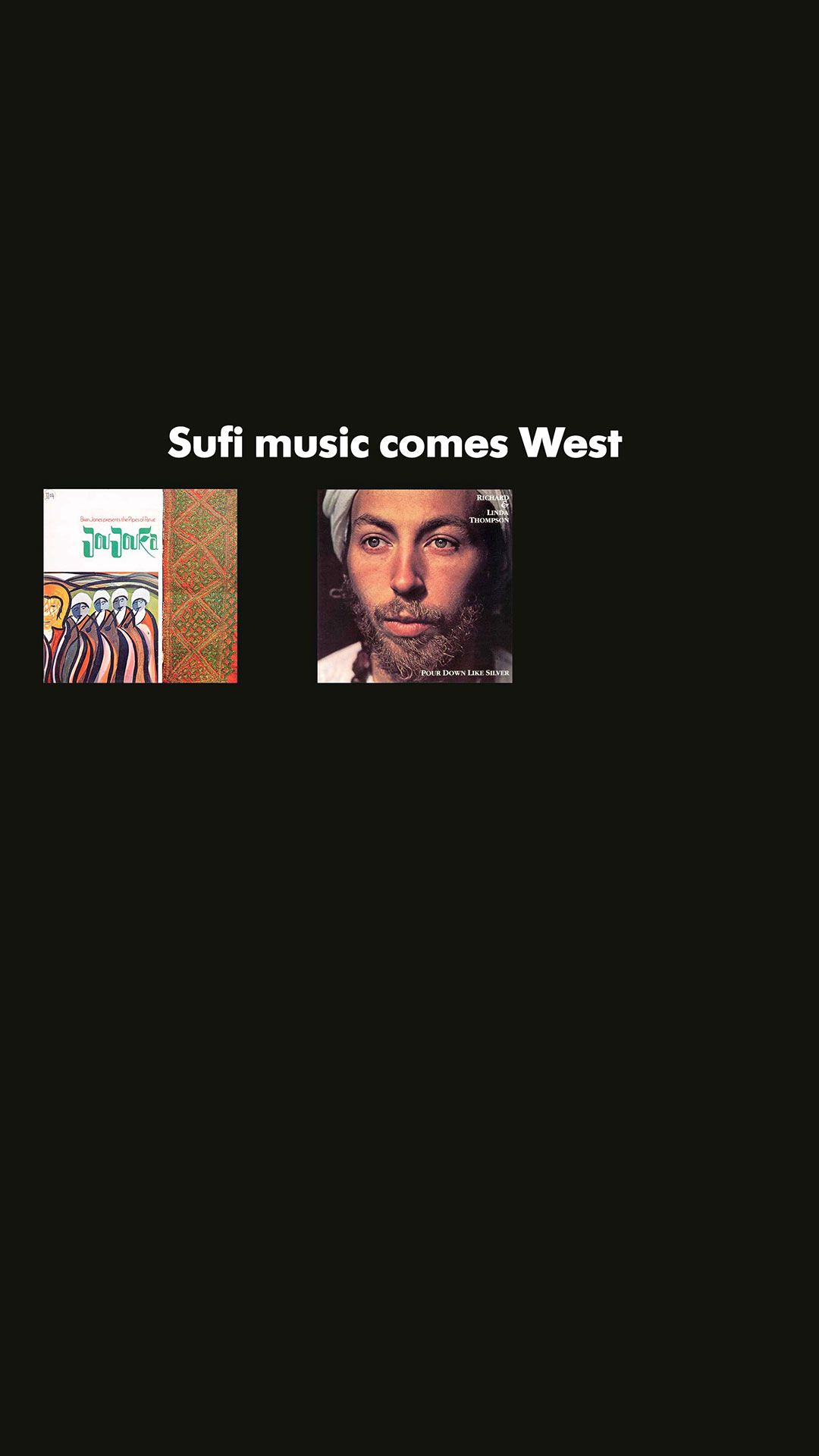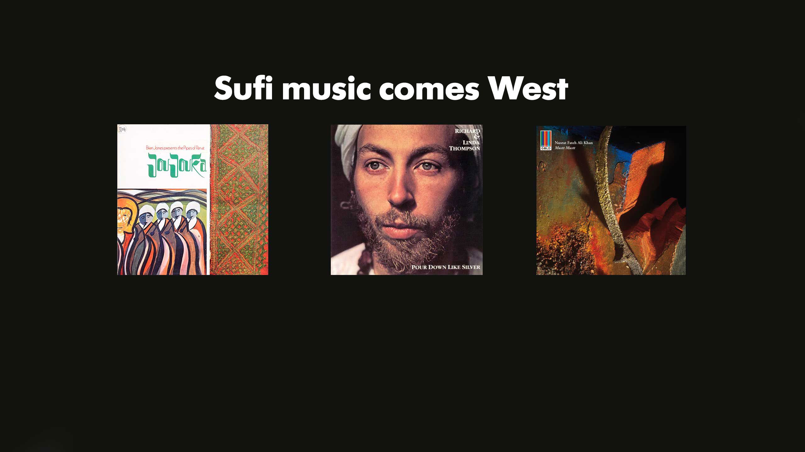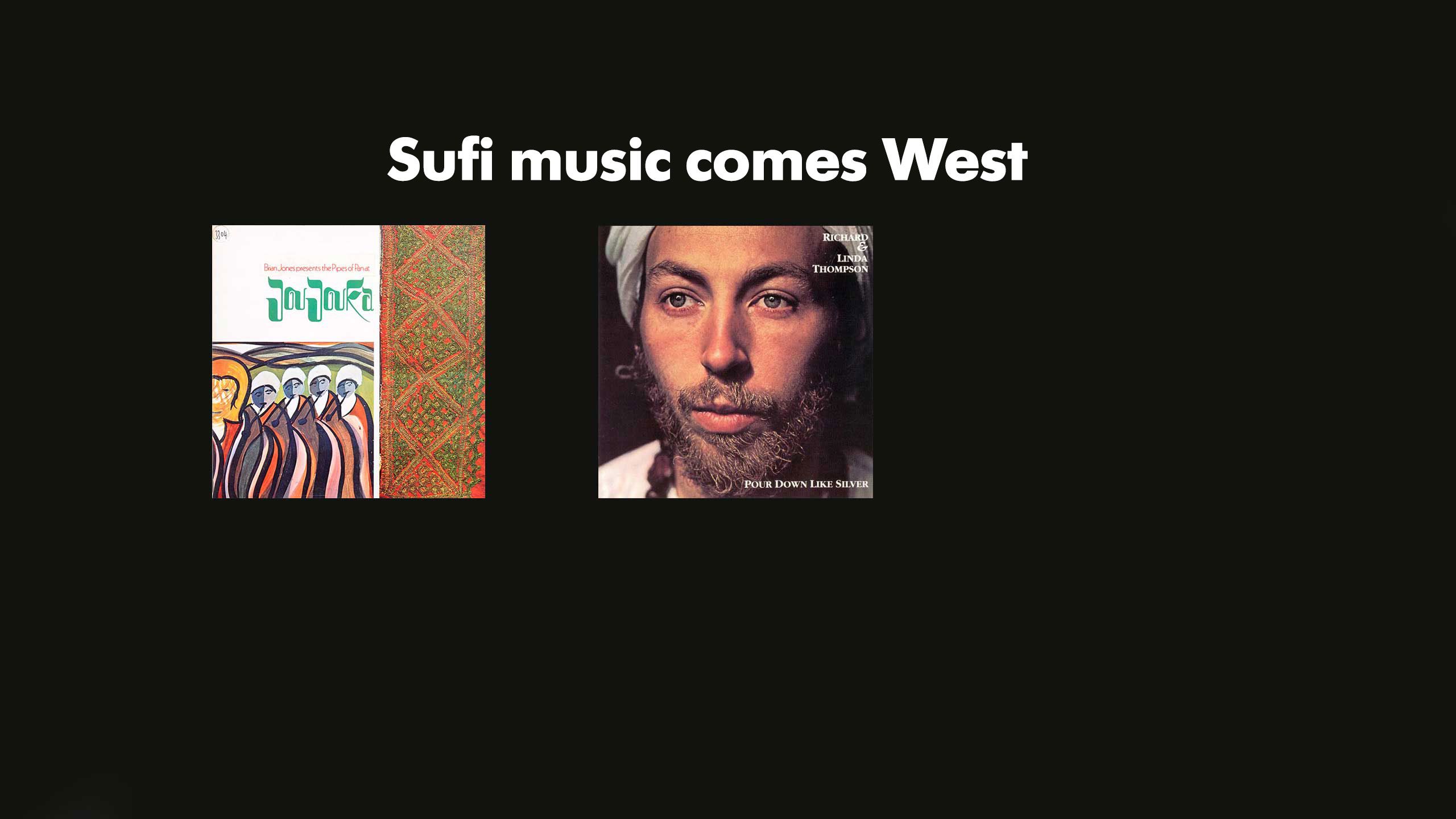 Richard Thompson started his career with the band Fairport Convention, and was heavily influenced by Sufism. By 1974 he had joined a Sufi Order based in East Anglia and in his 1975 album Pour Down Like Silver he presents a number of Sufi inspired folk songs in English. The sound is very Western but the esoteric and mystical meaning is clearly Sufi.